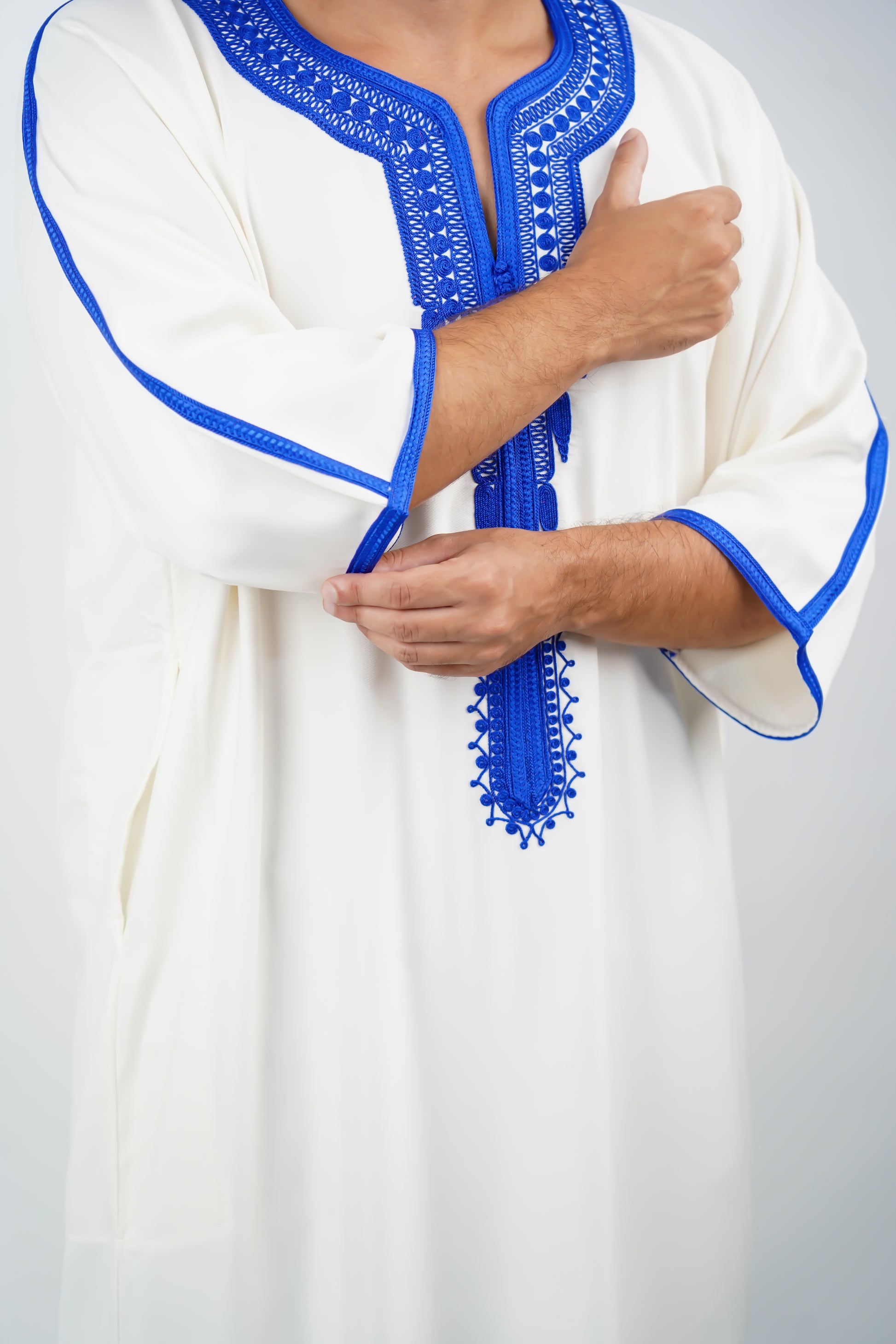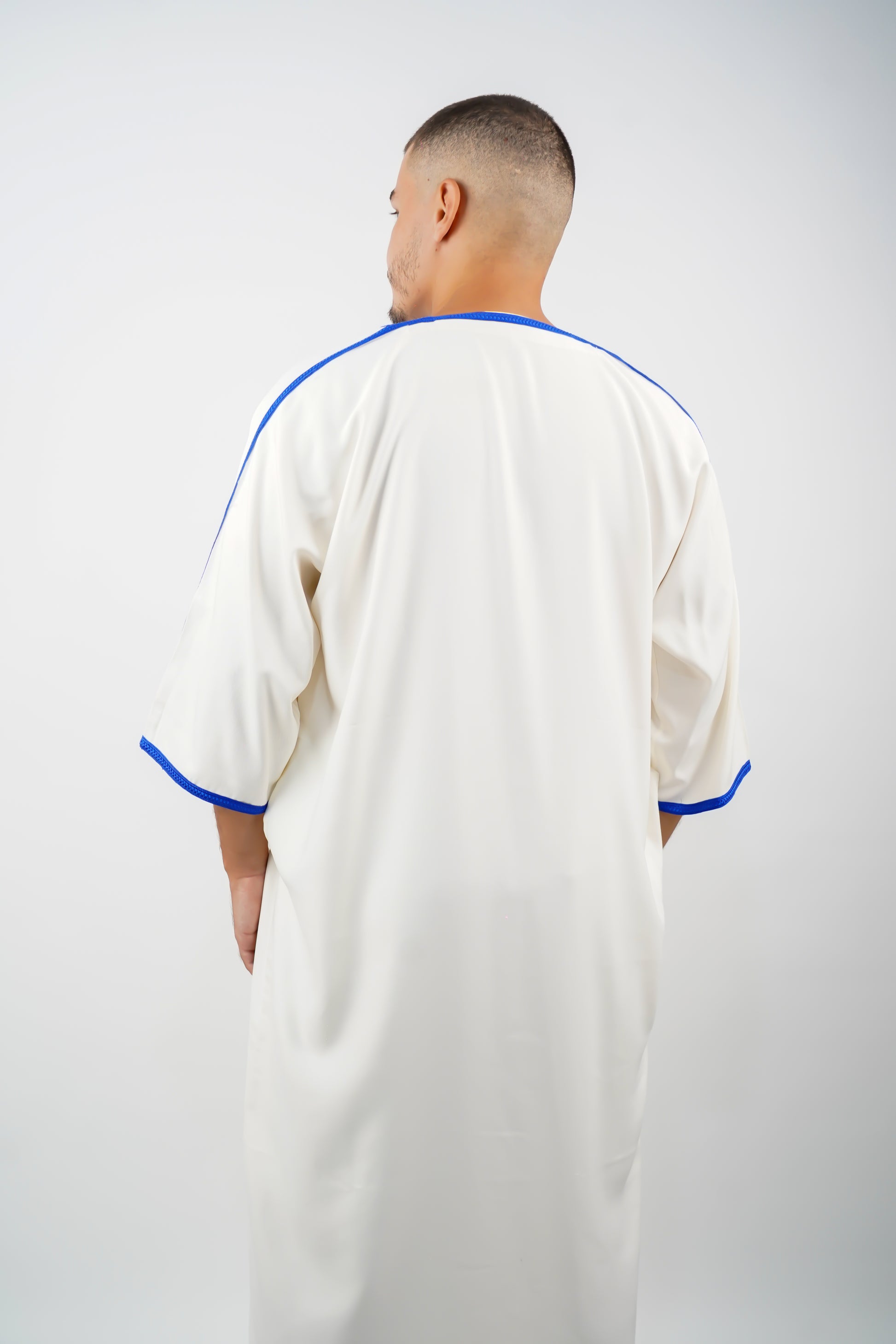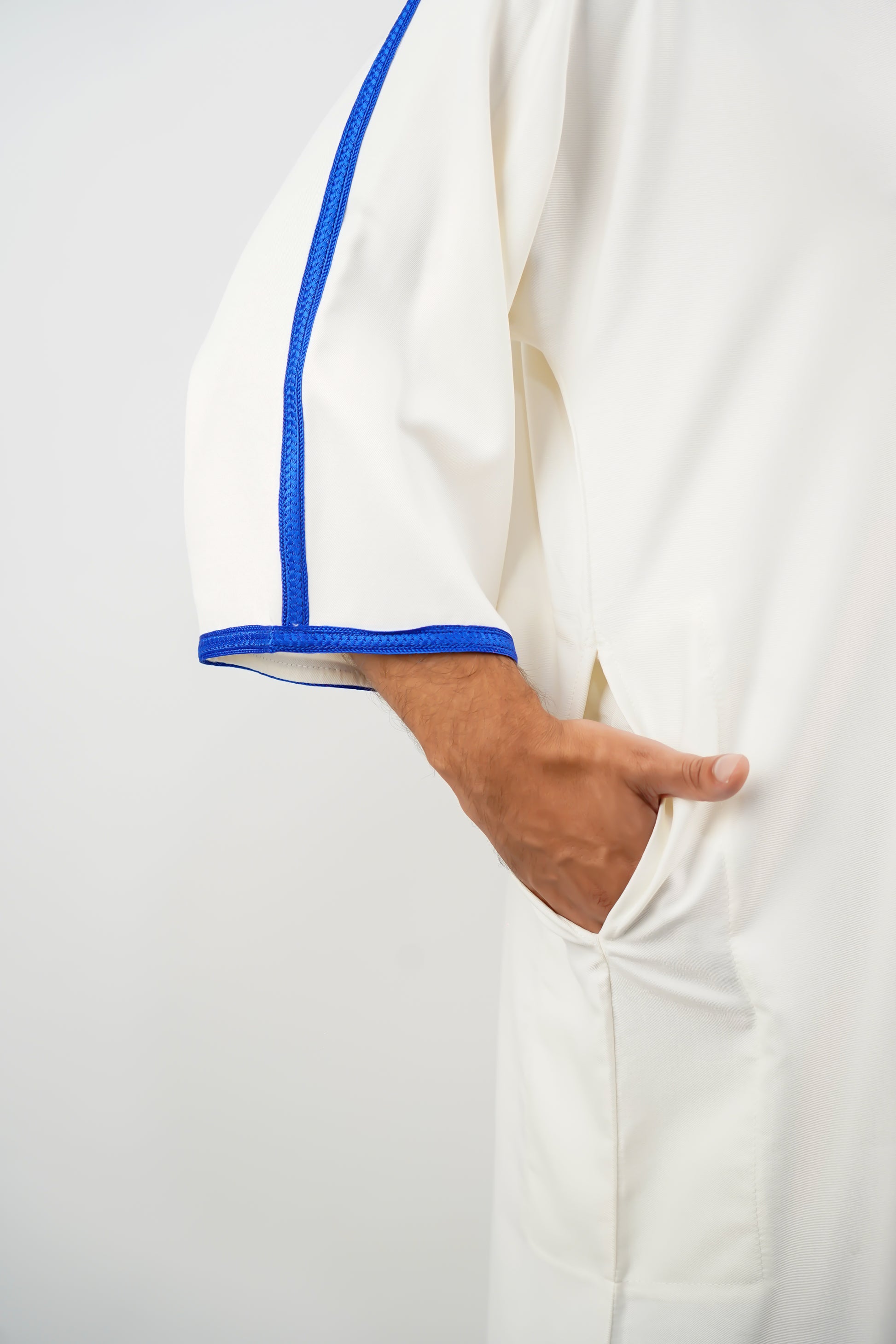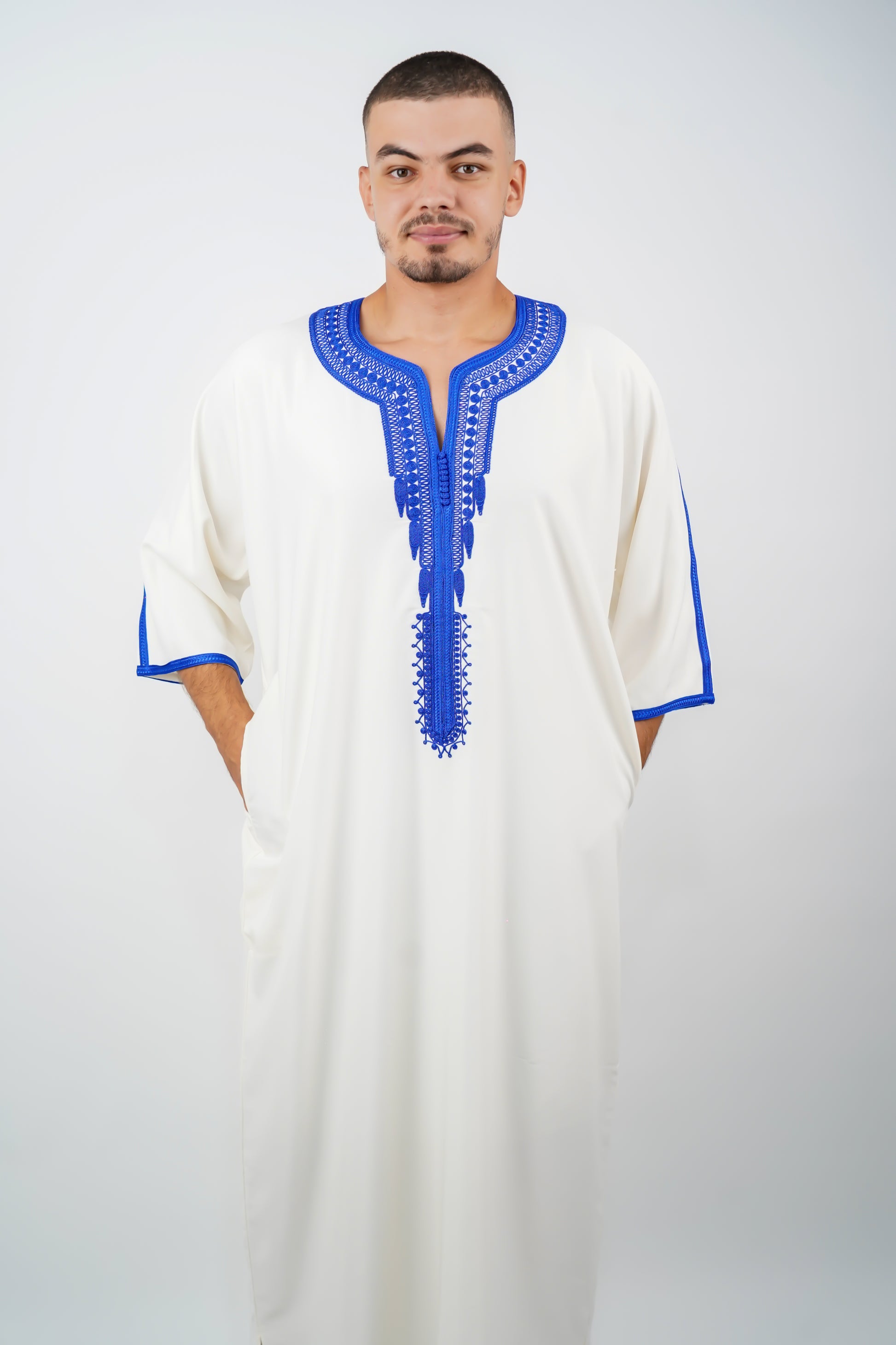 The White & Byzantine Blue Gandoura is a versatile and stylish addition to any wardrobe.